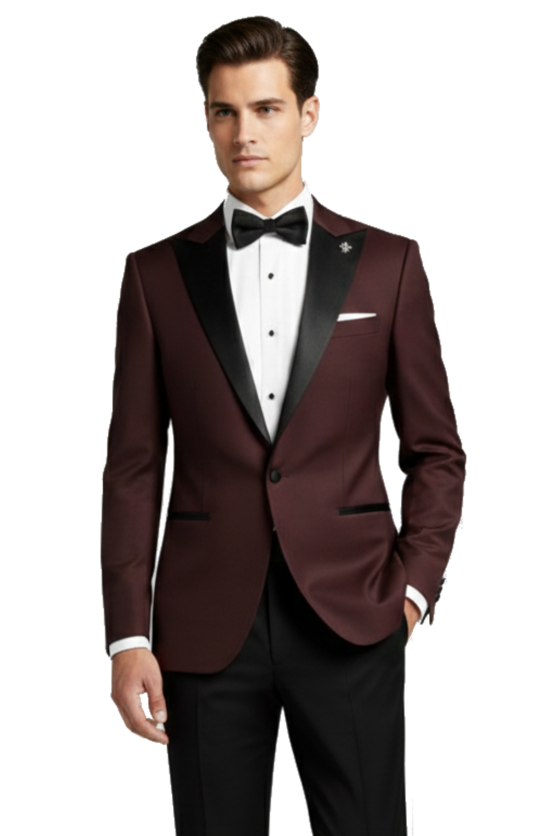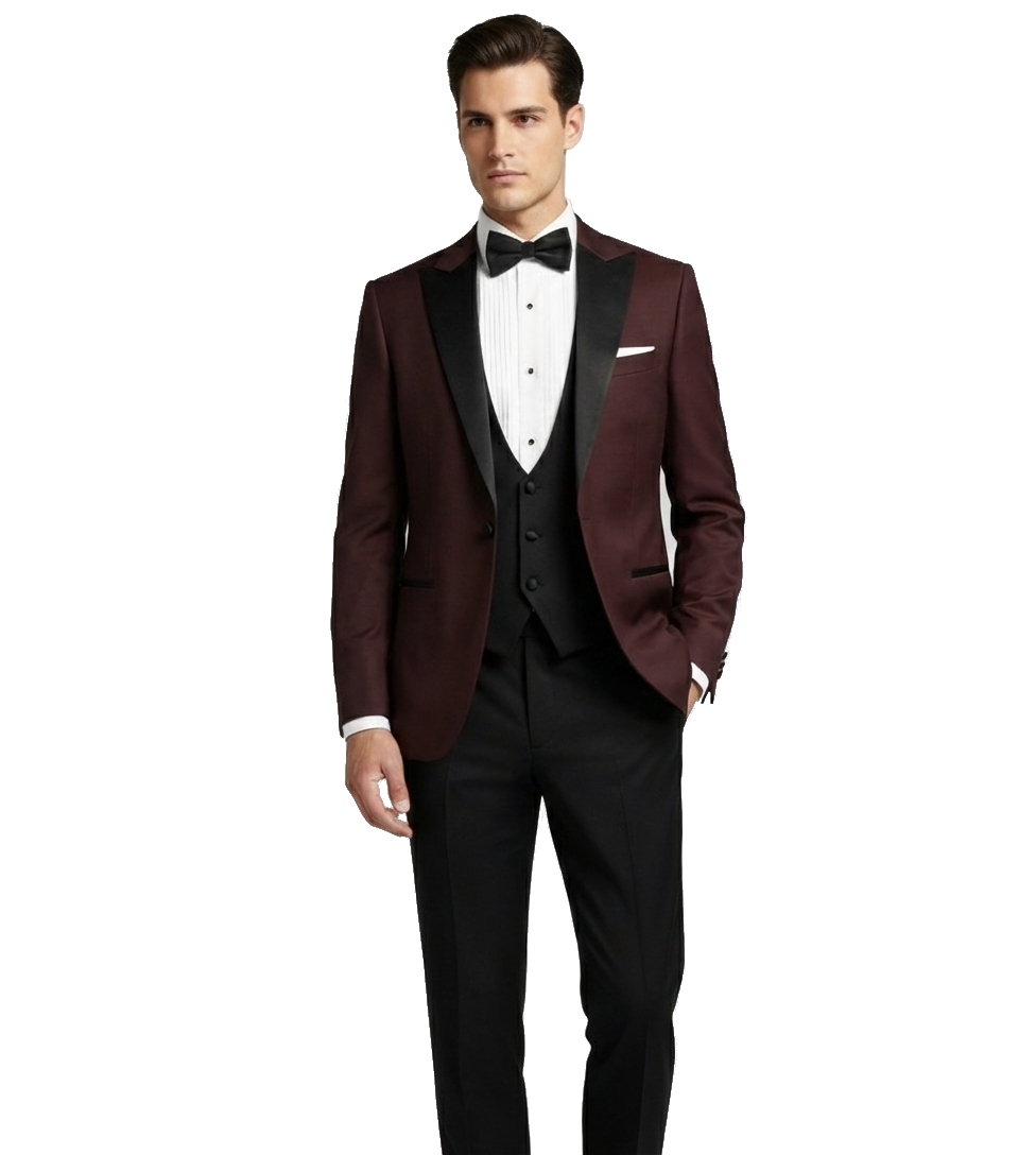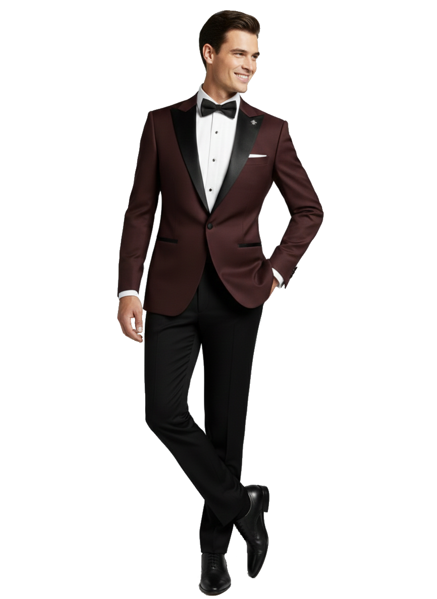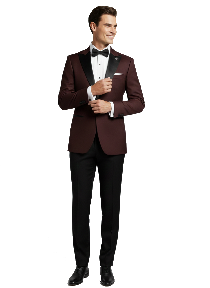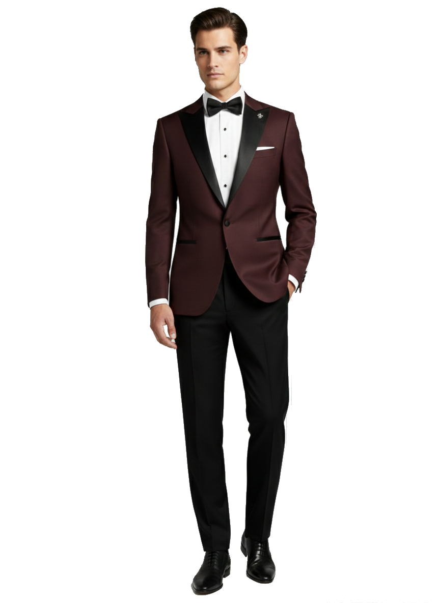 Burgundský pánský svatební smoking BORGOGNA s saténovými klopami do špičky.