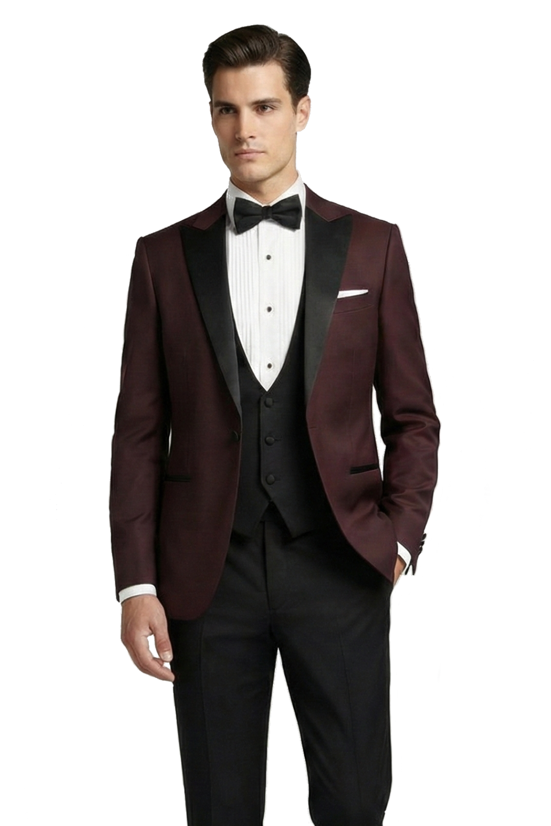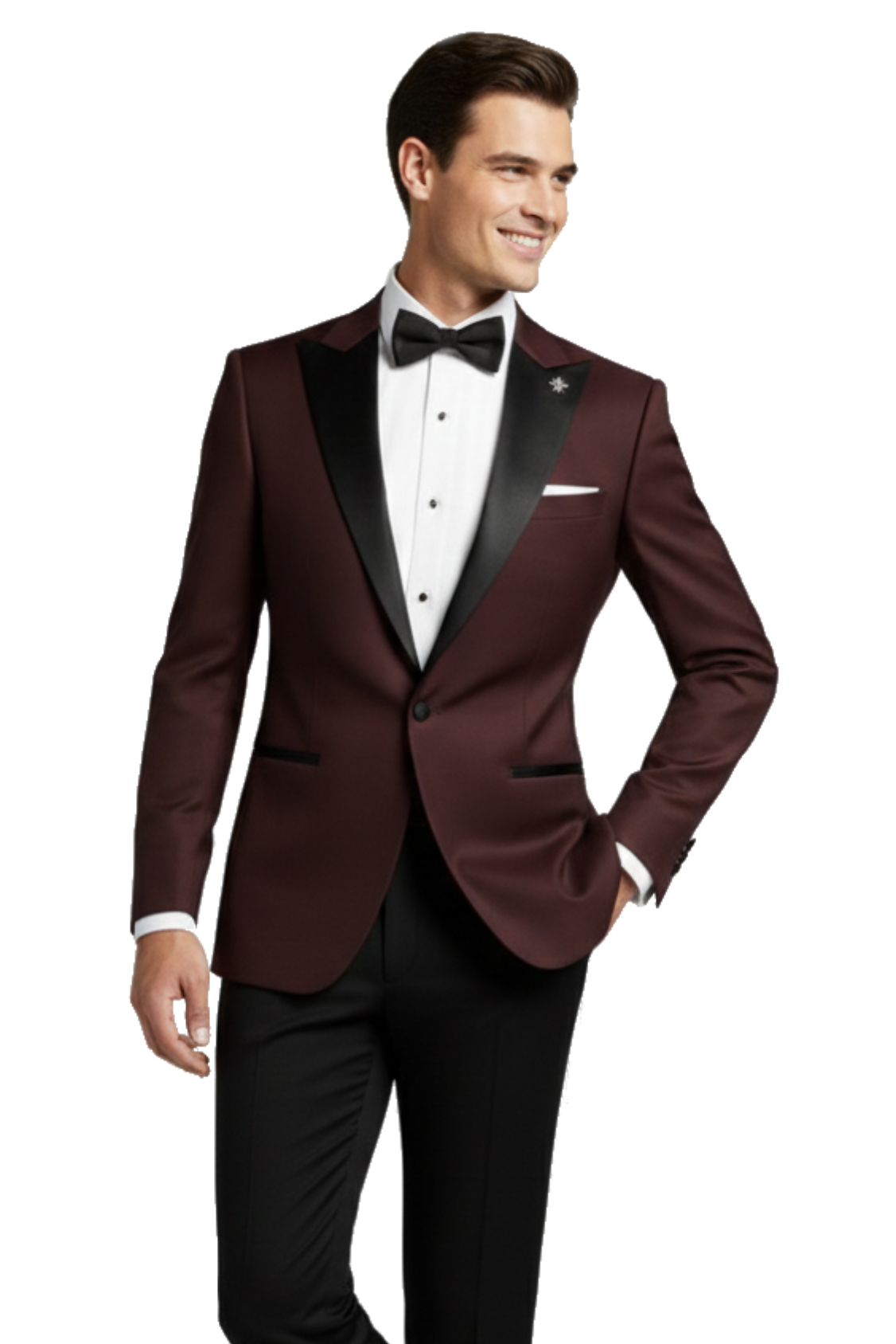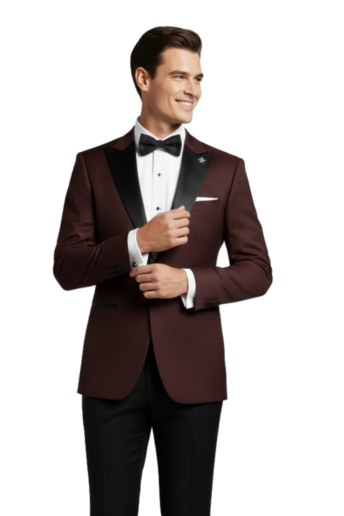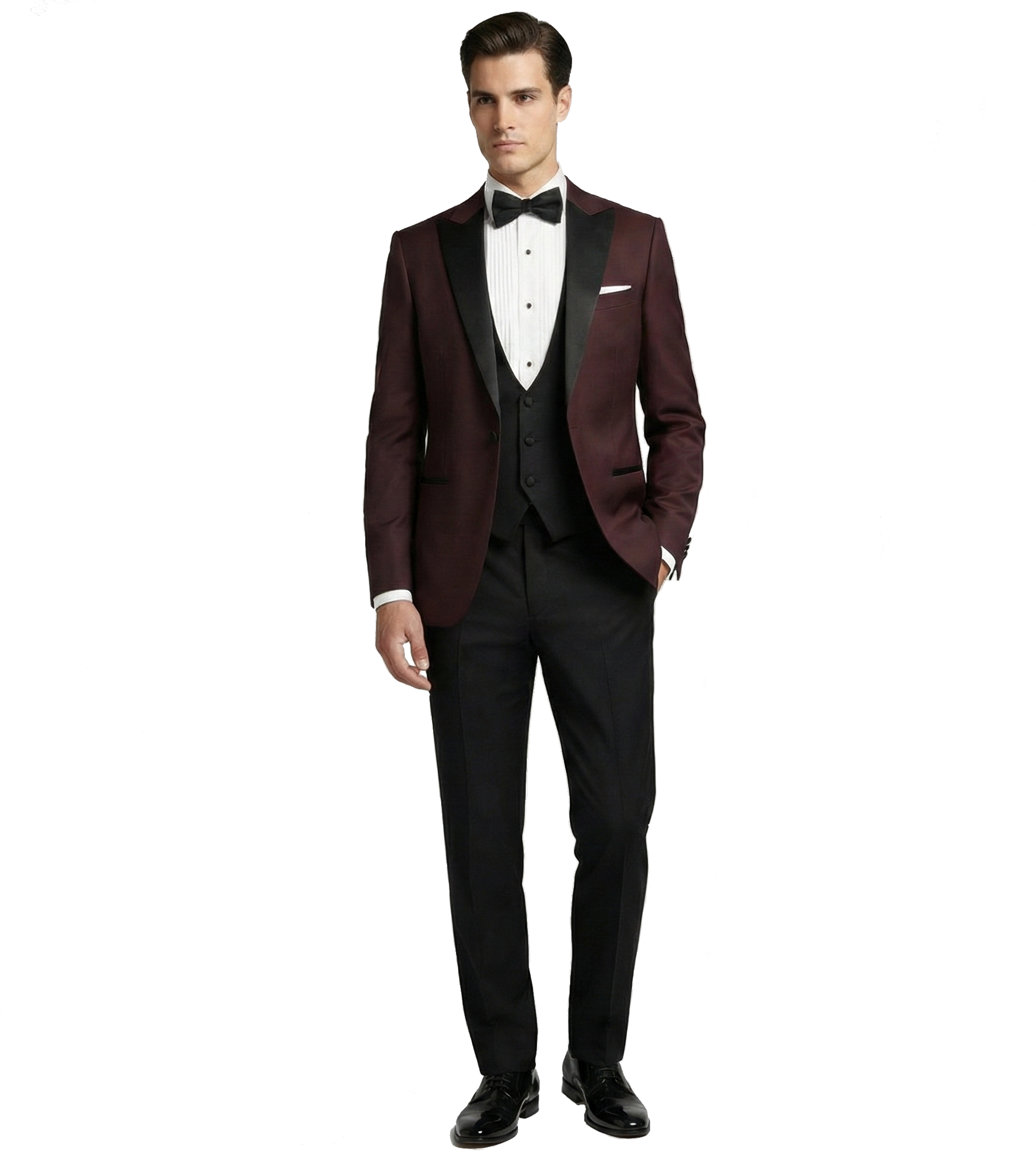 Burgundský pánský svatební smoking BORGOGNA s saténovými klopami do špičky.