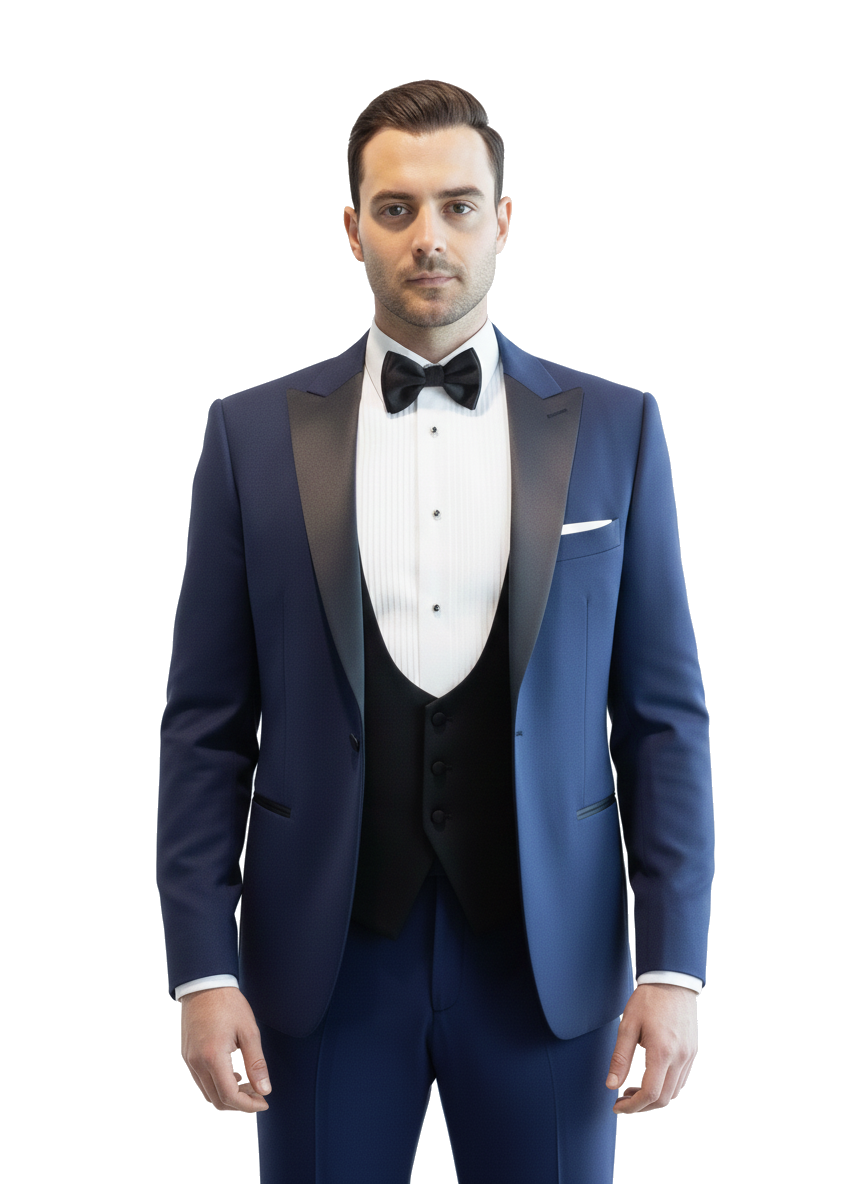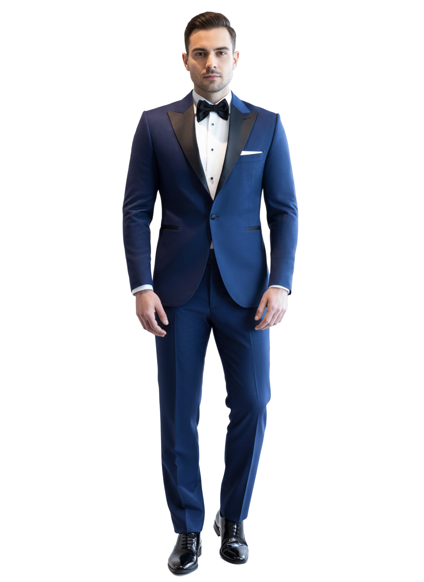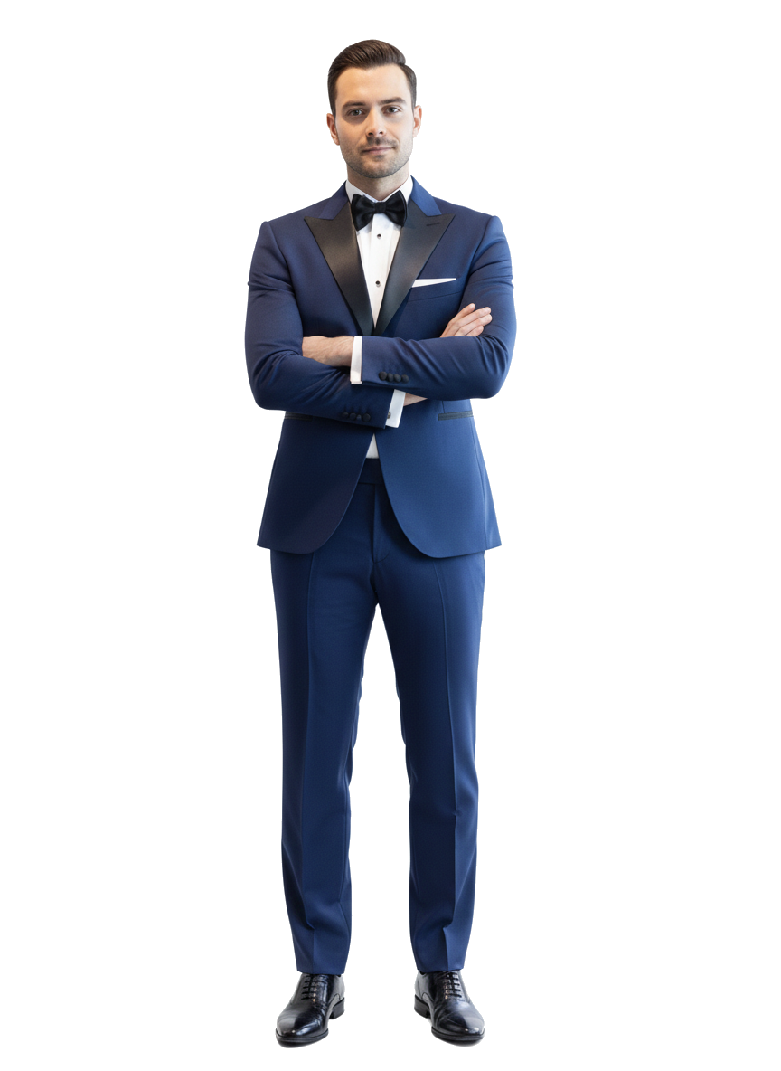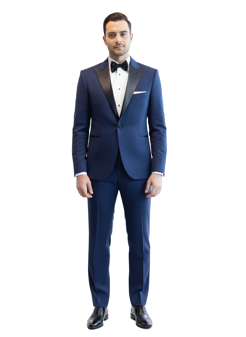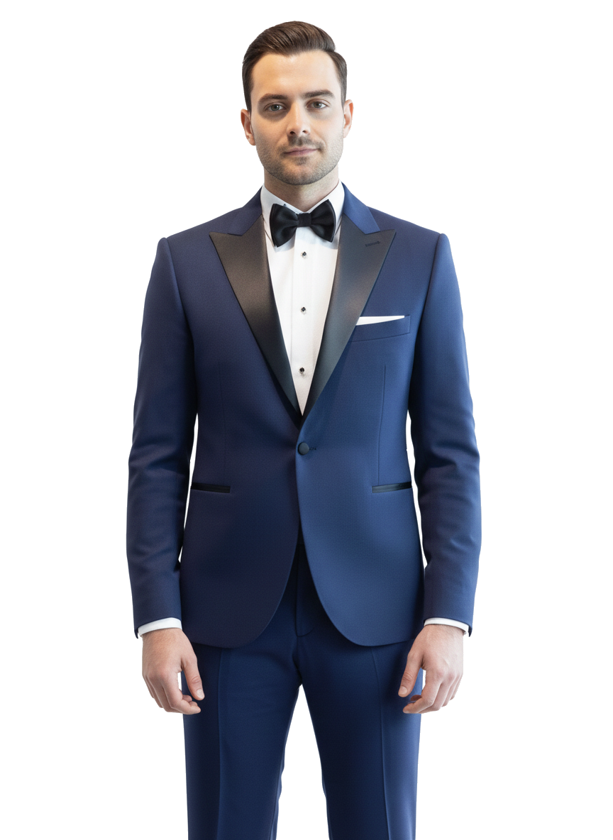 Modrý pánský smoking MARE s saténovými klopami ve špičce šitý na míru